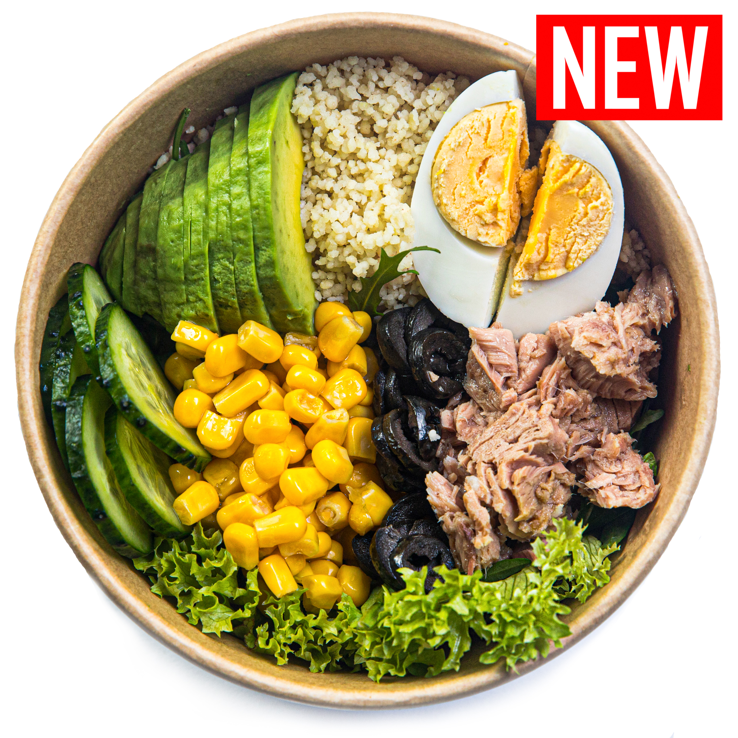 Тунець, кус-кус, кукурудза, авокадо, огірок, яйце, маслини, лист салату, рукола, 210гр.
